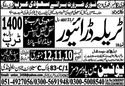 Union Manpower Services is looking for candidates for following posts as per job advertisement published in daily Express Newspaper of January 10, 2024 for location Riyadh, riyadh Saudi Arabia:
