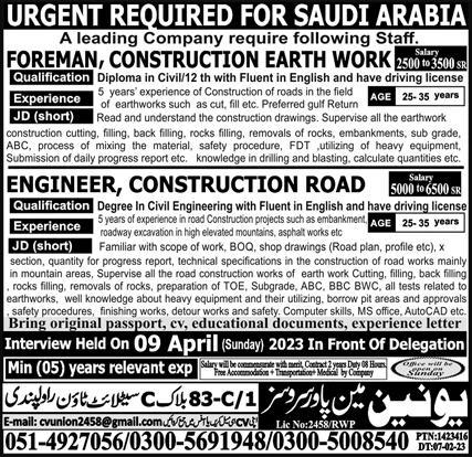 Vacant posts including foreman and engineer are announced in Union Manpower Services Riyadh, riyadh Saudi Arabia as per 8 April 2023 advertisement in daily Express Newspaper. Candidates with Intermediate, Matric and Bachelor etc. educational background will be preferred.