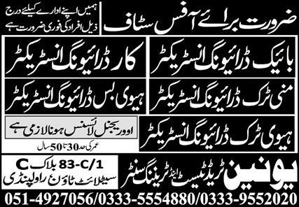 Union Trade Test and Training Center jobs advertisement dated about 26 April 2025 in daily Express Newspaper invites application for the vacant post of bike driving instructor, car driving instructor, heavy bus driving instructor, mini truck driving instructor, office staff and heavy truck driving instructor in Satellite Town - Block C Rawalpindi, rawalpindi Punjab Pakistan. Persons with Intermediate, Bachelor and Matric etc. education can apply.