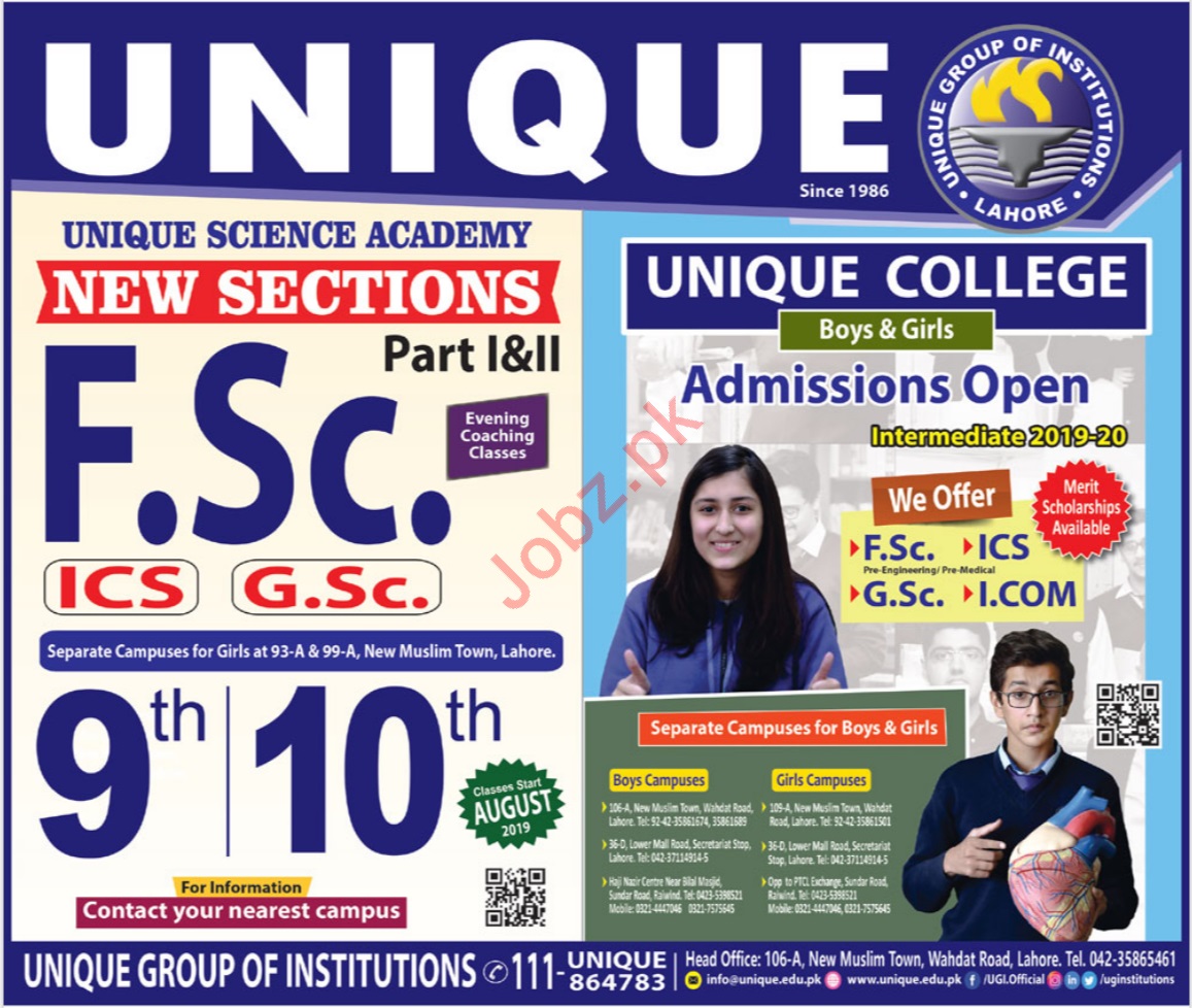 Unique College & Science Academy offers admissions in F.Sc, ICS, G.S.c and ICOM in college and Coaching classes for F.S.c, ICS, G.Sc, 9th and 10th in evening in Lahore. Read newspaper ad for exact details.
