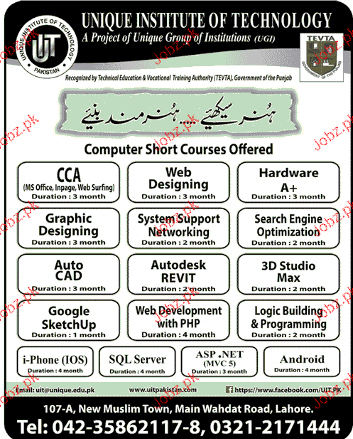 Unique Institute of Technology Admission in Courses in Lahore. Read newspaper ad for exact details.