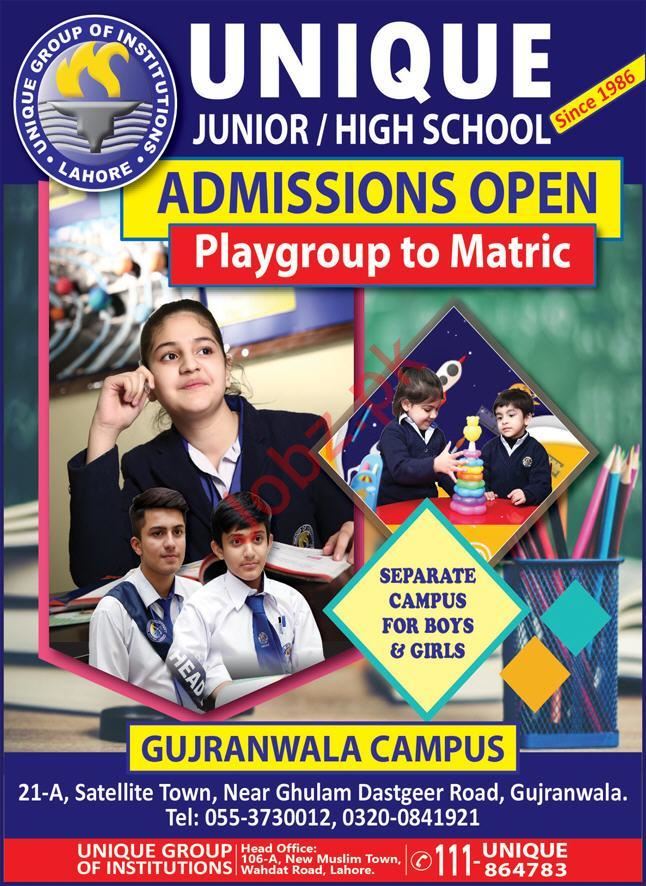 Unique Group of Institutions has announced admissions in Playgroup, Class I, Class II, Class III, Class IV, Class V, Class VI, Class VII, Class VIII, Class IX and Matric in Gujranwala Campus. Read newspaper ad for exact details.