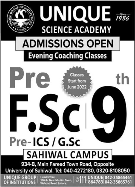 Unique Science Academy 9th Class, Intermediate Part I, Fsc Pre medical, Fsc Pre Engineering, ICS Computer Science, General Science, FA admissions 2022 has been announced. Unique Science Academy Sahiwal Punjab Pakistan welcomes students to apply for admissions in academic year 2022 in Science College. Students who want to enroll for academic session 2022 in Intermediate and Matric qualification and admission criteria for Private institute can apply till last date 30 June 2022. Read newspaper ad for exact details.