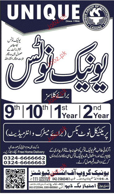 Unique Science Academy Admission in Matric and Fsc in Lahore. Read newspaper ad for exact details.
