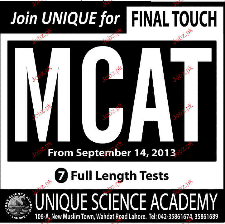 Unique Science Academy Admission in MCAT in Lahore Read newspaper ad for exact details.