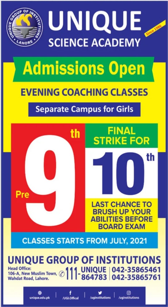 Unique Group of Institutions, Unique Science Academy invites applications for admissions in Class 9th and Class 10th in Lahore Punjab Pakistan 2021. Classes Starts From July 2021. Read newspaper ad for exact details.