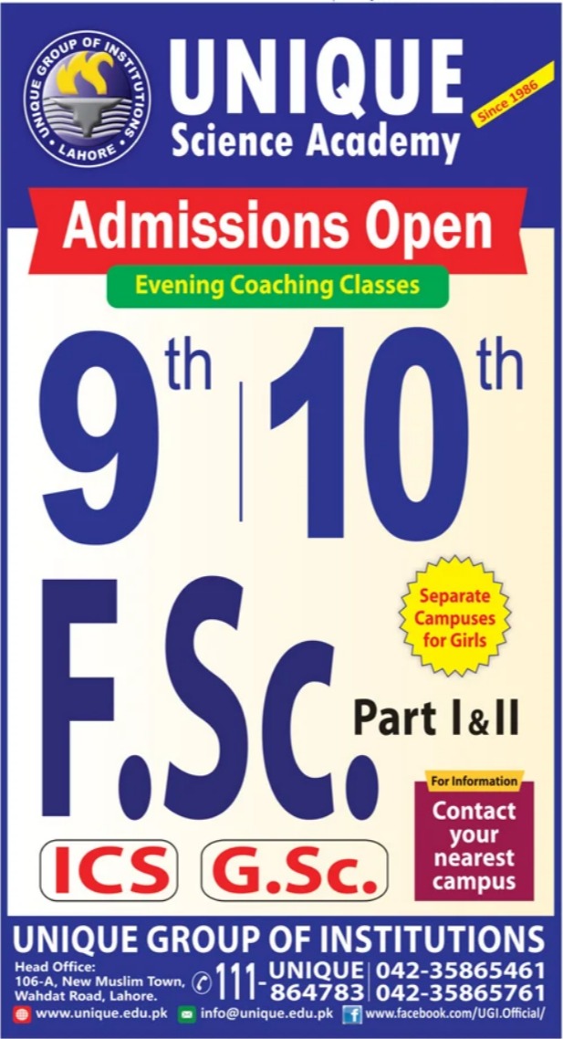A well known Academy in Lahore Unique Science Academy is offering admissions in class 9th, 10th and FSc. the interested students can now apply for admissions in the academy. Read newspaper ad for exact details.