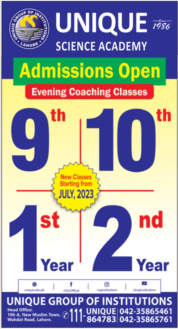 Unique Science Academy admissions 2023 for 9th Class, 101th Class, 1st Year, 2nd Years, Matric, Intermediate has been announced. Students can enroll for admissions in Unique Science Academy Lahore Punjab Pakistan for academic year 2023 to continue campus based or online education in Science College. Students for admissions in Intermediate and Matric can apply for online or campus classes as per Private institute criteria till admission closing date July 31, 2023. Read newspaper ad for exact details.