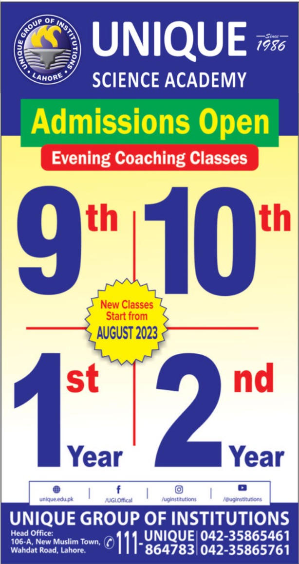 Unique Science Academy 9th Class, 10th Class, Matric, Intermediate, 1st Year, 2nd Year admissions 2023 has been announced. Eligible students who qualify as per admission criteria in Unique Science Academy Lahore Punjab Pakistan can apply in Science College for academic year 2023. Students for admissions in Intermediate and Matric can apply for online or campus classes as per Private institute criteria till admission closing date August 15, 2023. Read newspaper ad for exact details.