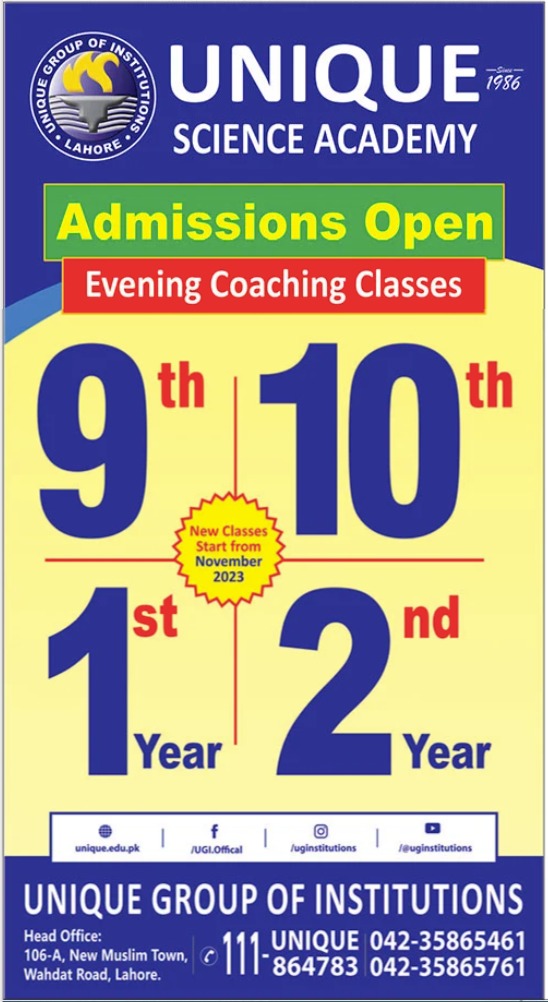 Unique Science Academy has announced admissions 2023 for 9th, 10th, 1st year and 2nd Year. Eligible students can apply for academic admissions 2023 in Unique Science Academy Lahore Punjab Pakistan for Science College. Students for admissions in Intermediate and Matric & criteria can apply as per Private institute admission policy 2023 before closing date December 5, 2023 as per advertisement. Read newspaper ad for exact details.