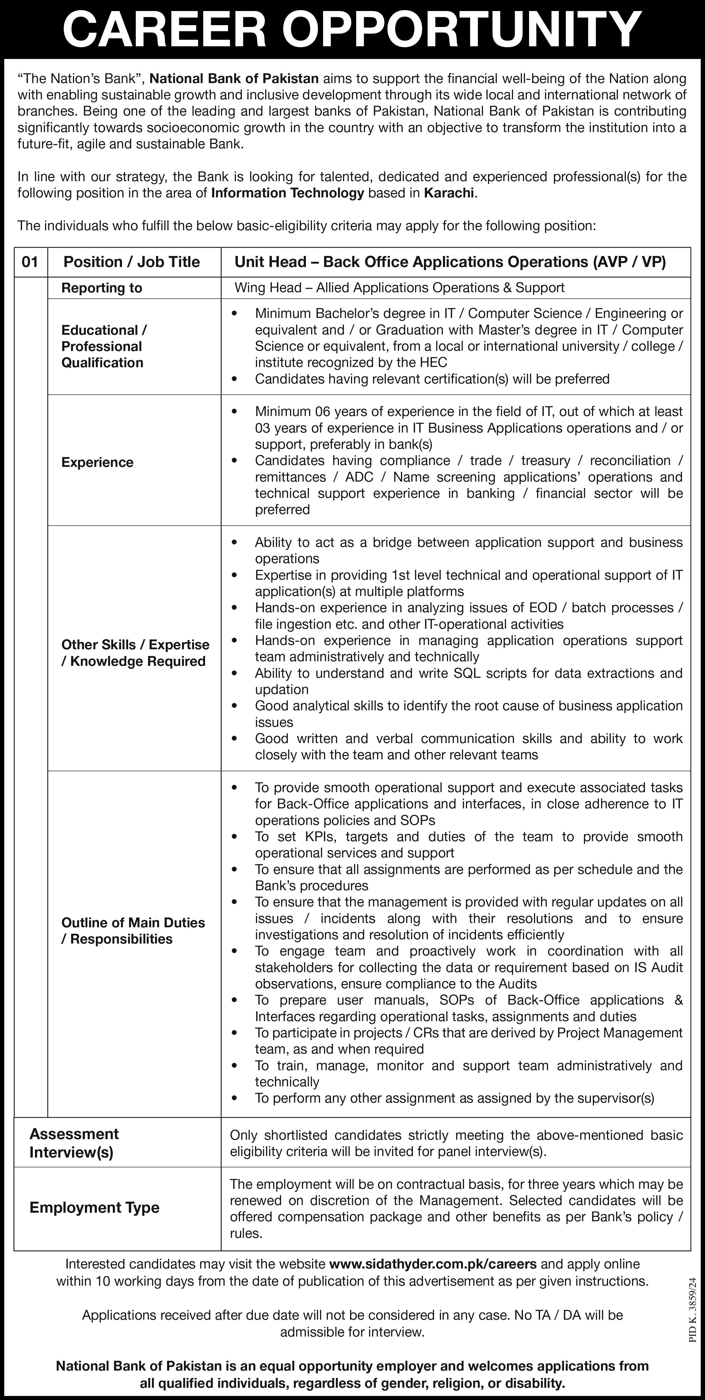 National Bank of Pakistan NBP, Sidat Hyder Morshed Associates invites applications for job positions advertised in daily Business Recorder dated 16 June 2025 for following vacancies in Karachi, karachi Sindh Pakistan.