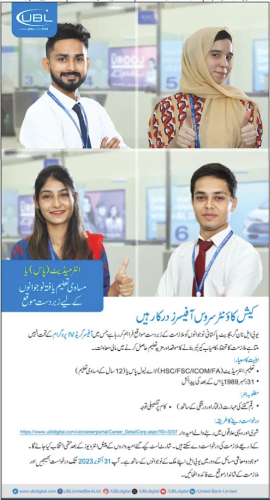 United Bank Limited UBL jobs advertisement dated about 9 October 2023 in daily Jang Newspaper invites application for the vacant post of cash counter service officer in Quetta, quetta Balochistan Pakistan. Persons with Intermediate etc. education can apply.