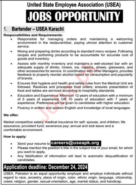 United State Employee Association USEA jobs advertisement dated about 15 December 2024 in daily Jang Newspaper invites application for the vacant post of bartender in Karachi, karachi Sindh Pakistan. Persons with Master, MS and Bachelor etc. education can apply.