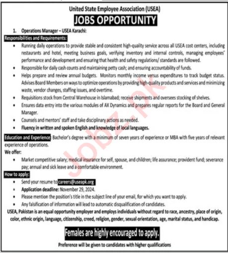 United State Employee Association USEA Islamabad, islamabad Islamabad Pakistan invites applications from eligible candidates for the post of operation manager as per advertisement of November 24, 2024 published in daily Jang Newspaper. MS, Bachelor and Master etc. educational qualification will be preferred.