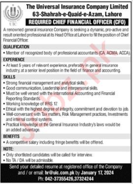 The Universal Insurance Company is looking for candidates for following posts as per job advertisement published in daily Jang Newspaper of January 7, 2024 for location Lahore, lahore Punjab Pakistan: