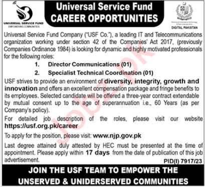 Universal Service Funds Lahore, lahore Punjab Pakistan invites applications from eligible candidates for the post of specialist technical coordinator and director communication as per advertisement of June 23, 2024 published in daily Jang Newspaper. Bachelor and Master etc. educational qualification will be preferred.