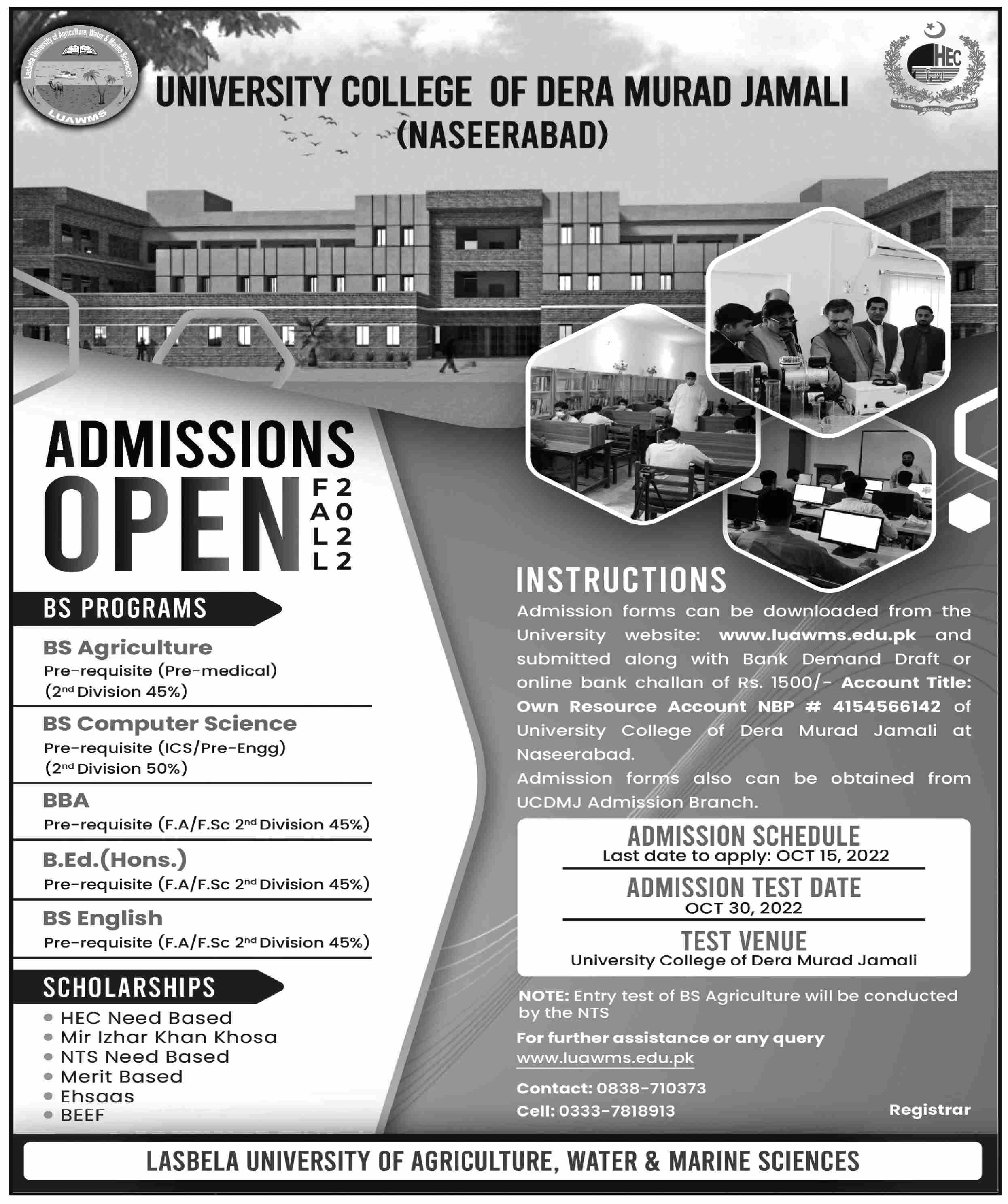University College of Dera Murad Jamali has announced admissions 2022 for BS Degree Program in Agriculture, Computer Science, BBA, BEd Hons, BS English. Eligible students can apply for academic admissions 2022 in University College of Dera Murad Jamali Naseerabad Balochistan Pakistan for Science University. Eligible students for fulfilling criteria for admissions in BS, B.ed and BBA can enroll as per Government admission policy 2022 till closing date 15 October 2022. Read newspaper ad for exact details.