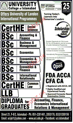 University College of Islamabad Admission in BSc, LLB and Diploma in Islamabad. Read newspaper ad for exact details.