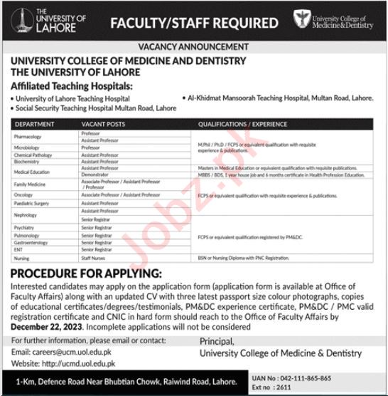 Vacant posts including staff nurse, professor, assistant professor, associate professor and registrar are announced in The University of Lahore UOL Lahore, lahore Punjab Pakistan as per 17 December 2023 advertisement in daily Jang Newspaper. Persons with MS, BDS, MBBS and Mphil etc. education can apply.