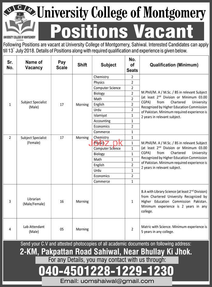 Latest University College of Montgomery UCM Teaching Posts Sahiwal 2025
