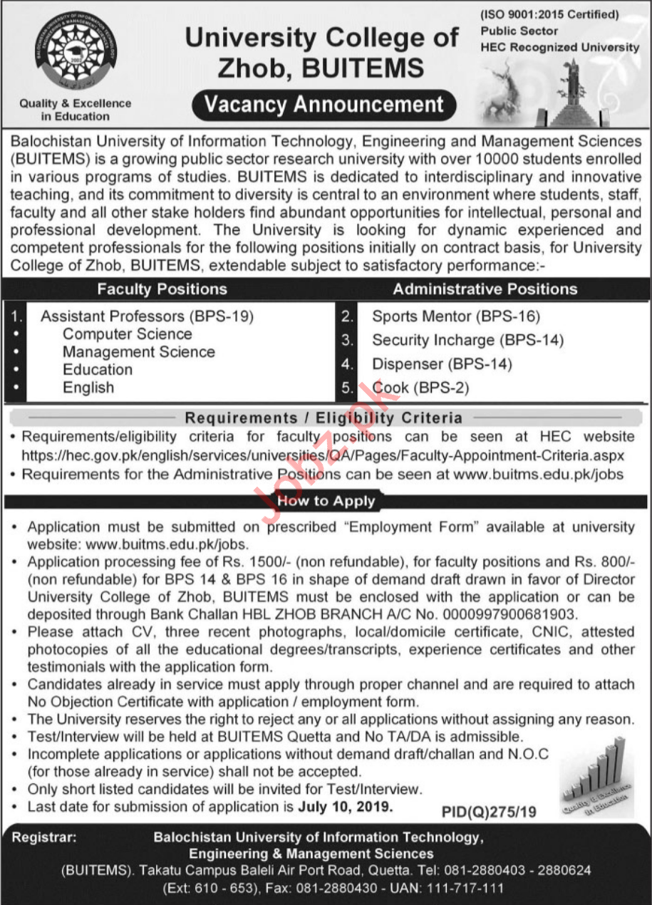 University College of Zhob BUITEMS Balochistan University of IT Engineering & Management Sciences is currently looking for highly qualified and well educated individuals for the posts of Assistant Professor Computer Science, Assistant Professor Management Science, Assistant Professor Education, Assistant Professor English, Sports Mentor, Security Incharge, Dispenser & Cook.