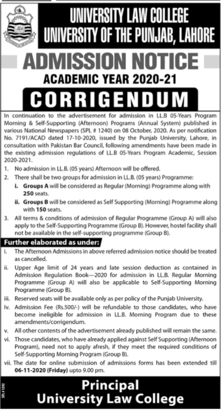 University Law College, University Of The Punjab invited applications for admissions in Bachelor of Laws LLB 5 Years Degree Programs in Lahore Punjab Pakistan 2020-2021. Read newspaper ad for exact details.
