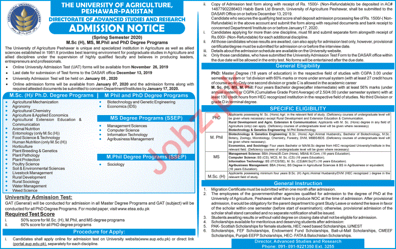 The University of Agriculture Peshawar Khyber Pakhtunkhwa KPK invites applications for admissions of MSc Hons, Master of Science MS, M.Phil, PhD Degree Programs. Read newspaper ad for exact details.