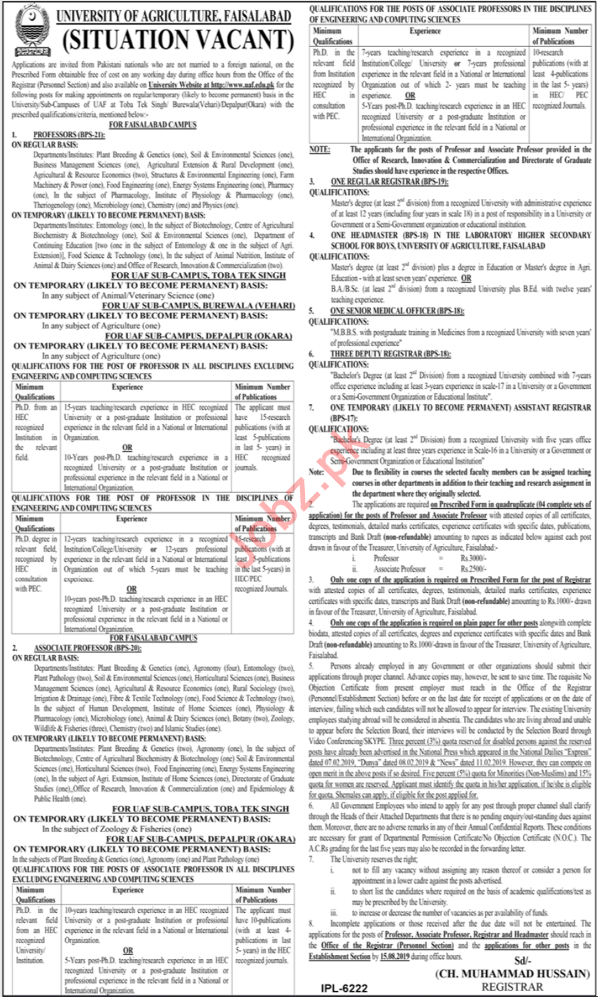 Vacancies in University of Agriculture UAF Advertisement July 2019