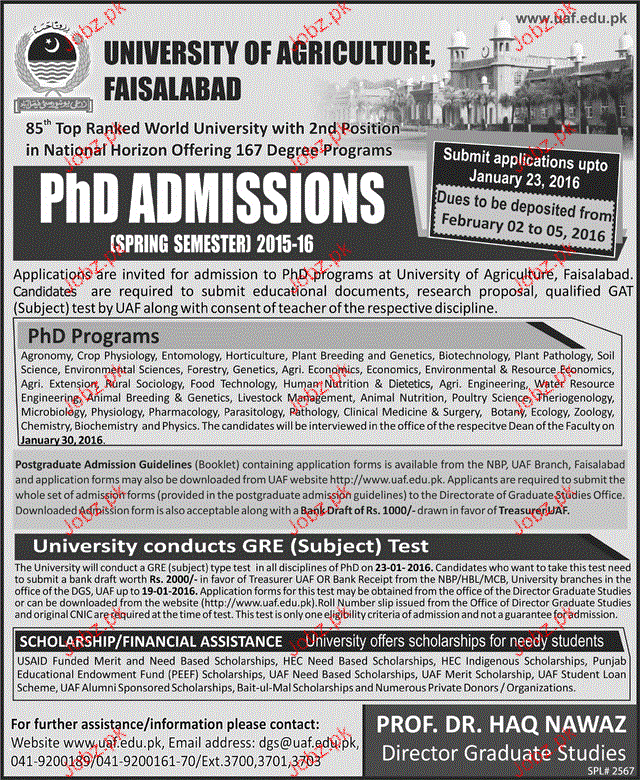 University of Agriculture Faisalabad Admission in Phd in Faisalabad. Read newspaper ad for exact details.