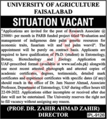 University of Agriculture UAF latest Government Research jobs and others can be applied till 22 September 2022 or as per closing date in newspaper ad. Read complete ad online to know how to apply on latest University of Agriculture UAF job opportunities.