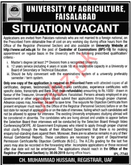 Vacancies in University of Agriculture UAF Advertisement August 2019
