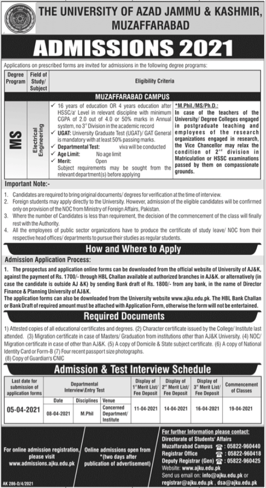 The University of Azad Jammu & Kashmir is a public sector university invites applications for online admissions in MS Electrical Engineering in Muzaffarabad Campus AJK 2021. Read newspaper ad for exact details.