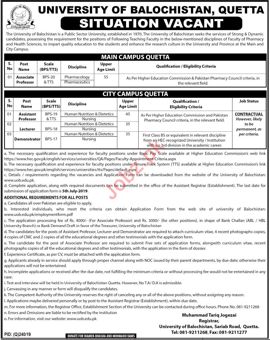University of Balochistan is looking for Associate Professor, Associate Professor Pharmacology, Associate Professor Pharmaceutics, Assistant Professor Human Nutrition , Assistant Professor Dietetics, Assistant Professor Nursing, Lecturer, Human Nutrition Lecturer, Dietetics Lecturer, Nursing Lecturer, Demonstrator, Human Nutrition Demonstrator, Dietetics Demonstrator, Nursing Demonstrator in Quetta