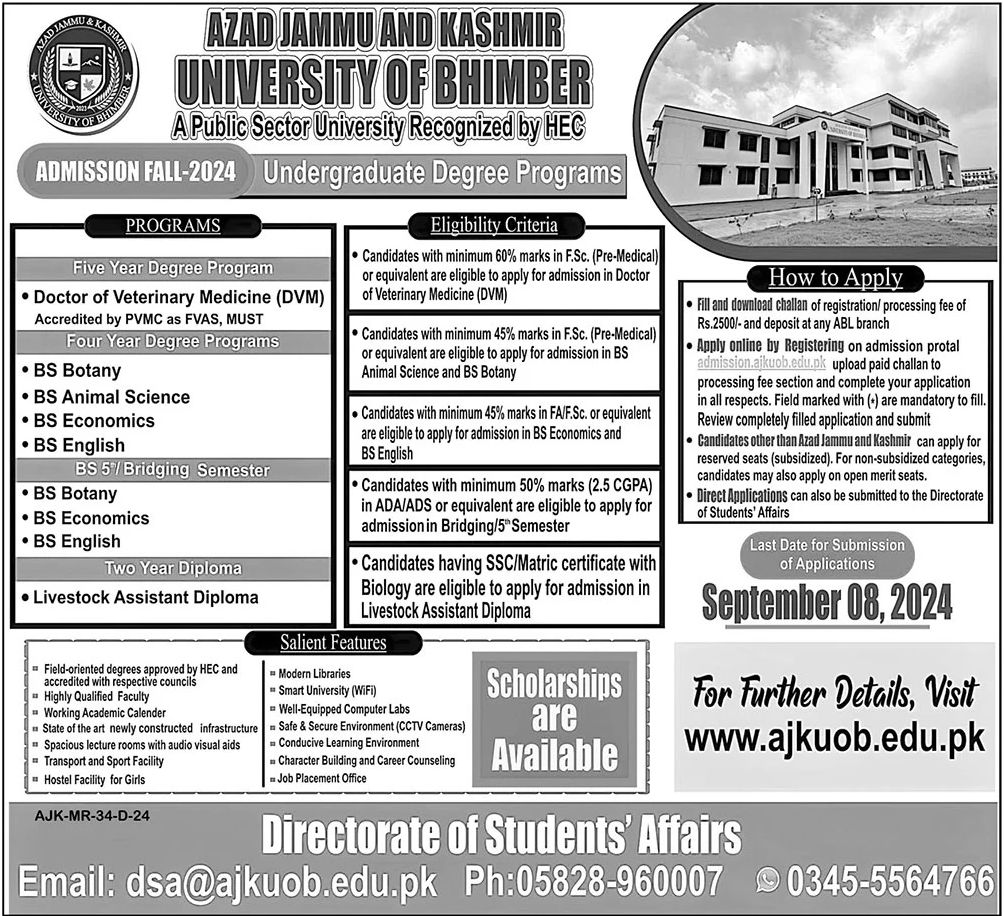 University of Bhimber has announced admissions 2024 for Doctor of Veterinary Medicine, Botany, Animal Sciences, English, Livestock Assistant Diploma . Students can enroll for admissions in University of Bhimber Bhimber AJK Pakistan for academic year 2024 to continue campus based or online education in Teaching University. Students for admissions in BS, Diploma and DVM & criteria can apply as per Government institute admission policy 2024 before closing date September 8, 2024 as per advertisement. Read newspaper ad for exact details.
