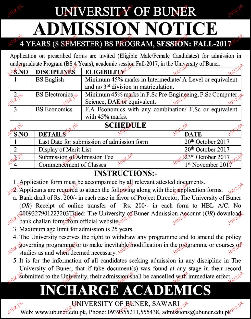 University of Buner Admission in BS in Buner. Read newspaper ad for exact details.