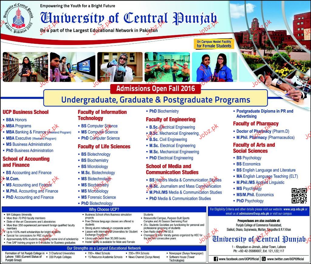 University of Central Punjab Admission in BBA, BS, MSC, Mphil and Phd in lahore. Read newspaper ad for exact details.
