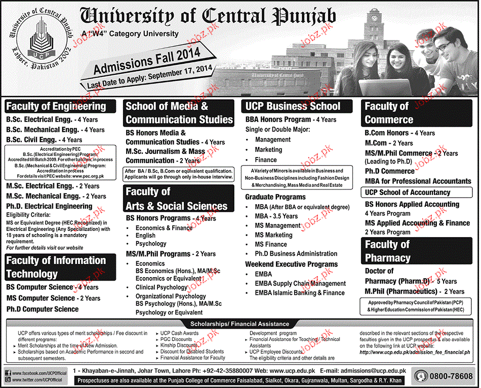 University of Central Punjab Admission in BS and Msc in Lahore. Read newspaper ad for exact details.