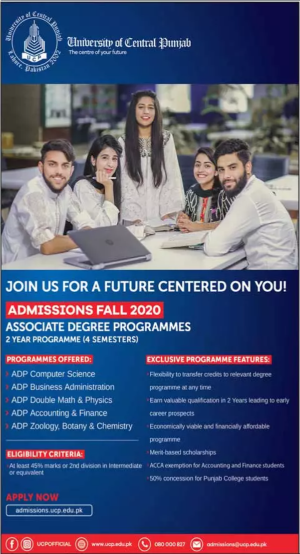 University of Central Punjab is a private sector university has announced admissions in Associate Degree Programmes ADP Computer Science, ADP Business Administration, ADP Double Math & Physics, ADP Accounting & Finance, ADP Zoology, Botany & Chemistry. Read newspaper ad for exact details.