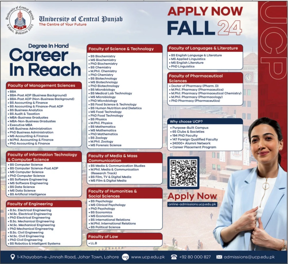 Admissions in University of Central Punjab 2024 for BS, MS, MPhil, PhD has been announced. Eligible students can apply for academic admissions 2024 in University of Central Punjab Lahore Punjab Pakistan for Science University. Students for admissions in Mphil, Pharm D, MS, Phd and BS & criteria can apply as per Private institute admission policy 2024 before closing date June 10, 2024 as per advertisement. Read newspaper ad for exact details.