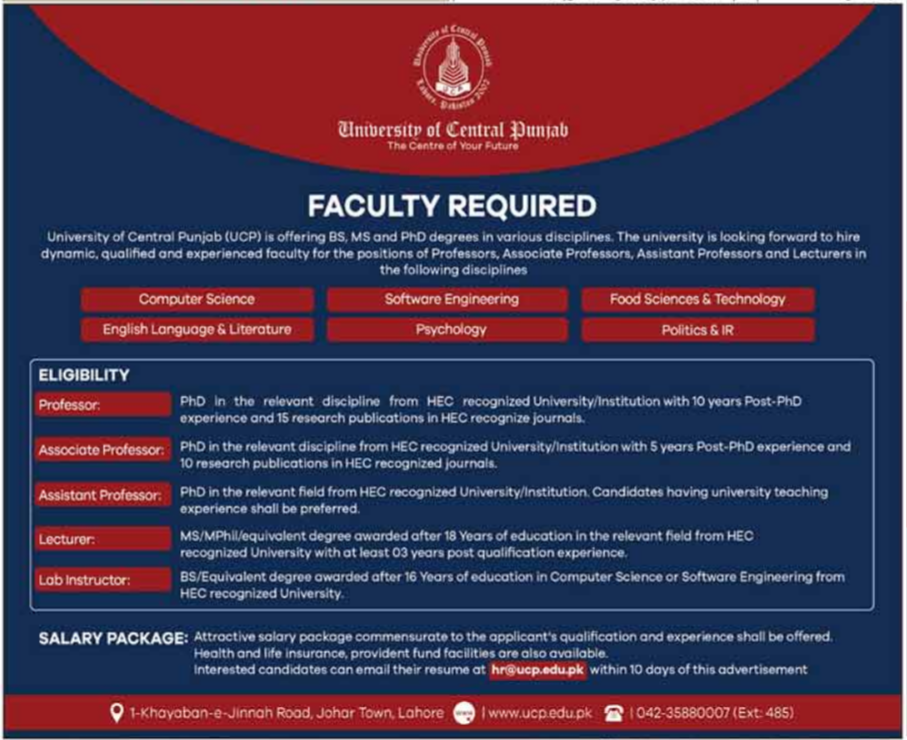 Latest University of Central Punjab Teaching Posts Lahore 2025
