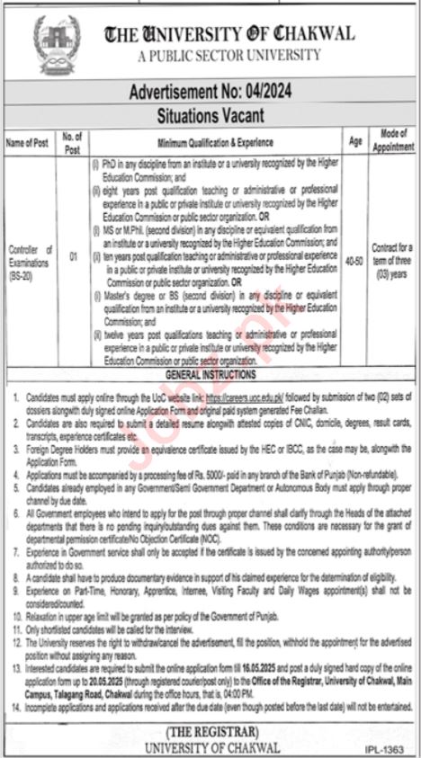 University of Chakwal latest Government Education jobs and others can be applied till 20 April 2025 or as per closing date in newspaper ad. Read complete ad online to know how to apply on latest University of Chakwal job opportunities.