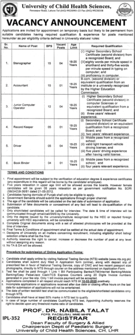 Vacant posts including book binder, computer operator, driver, accountant, record keeper and stenographer are announced in University of Child Health Sciences Lahore, lahore Punjab Pakistan as per 25 January 2025 advertisement in daily Jang Newspaper. Educational qualifications required Intermediate, Bachelor, Middle, B.com, DAE and Matric etc.