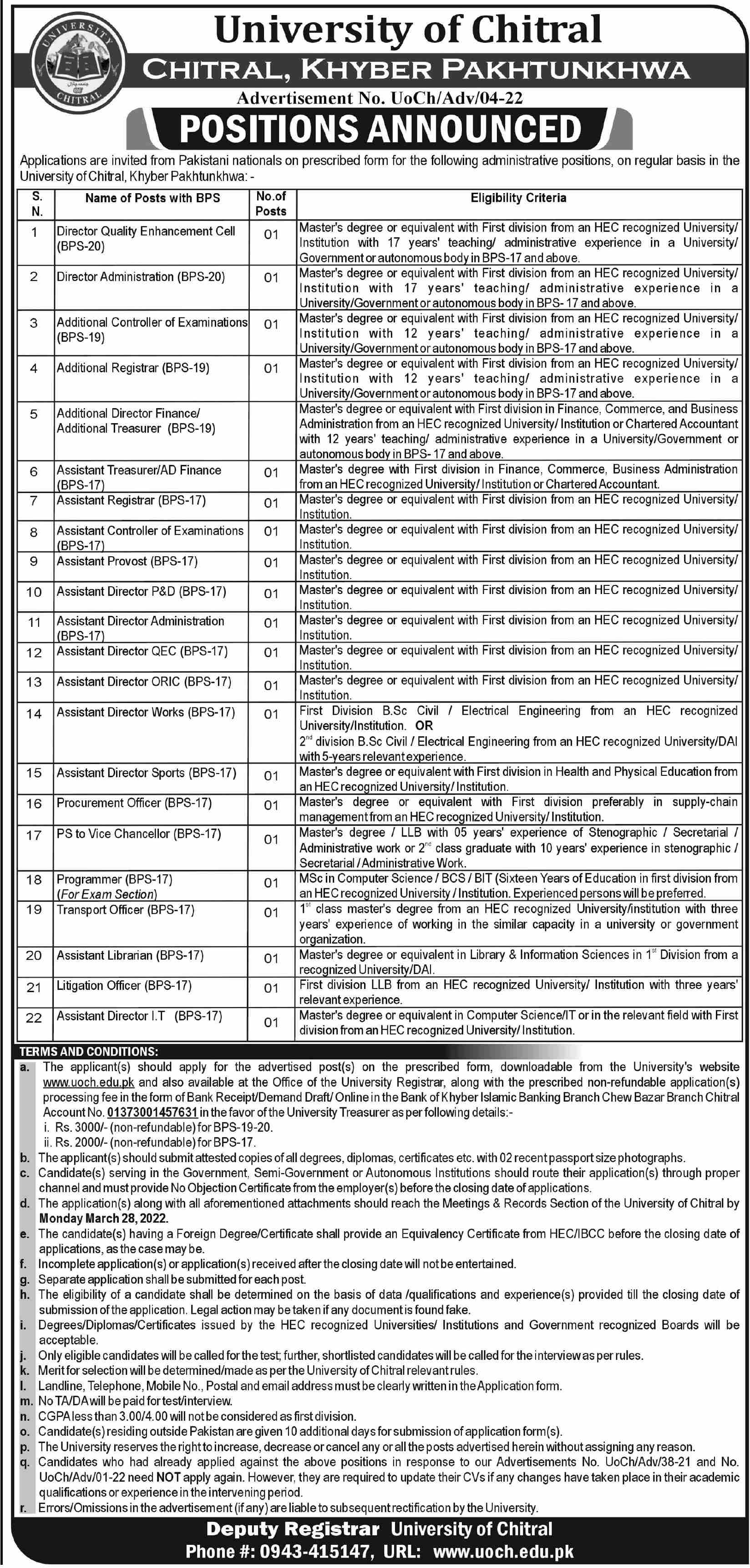 Vacant posts including assistant provost, assistant director planning, additional director finance, assistant treasurer, assistant director administration, assistant director works, assistant director sports, personal secretary, director administration, additional registrar, assistant registrar, assistant controller of examinations, assistant director oric, transport officer, procurement officer, programmer, ps, assistant director qec, director quality enhancement cell, assistant director development, aditional controller of examinations, assistant director it, assistant librarian, additional treasurer and litigation officer are announced in University of Chitral Chitral, chitral Khyber Pakhtunkhwa KPK Pakistan as per 12 March 2022 advertisement in daily Dawn Newspaper. Persons with Mphil, M.sc, BIT, Master, Others, BCS, Bachelor and LLb etc. education can apply.