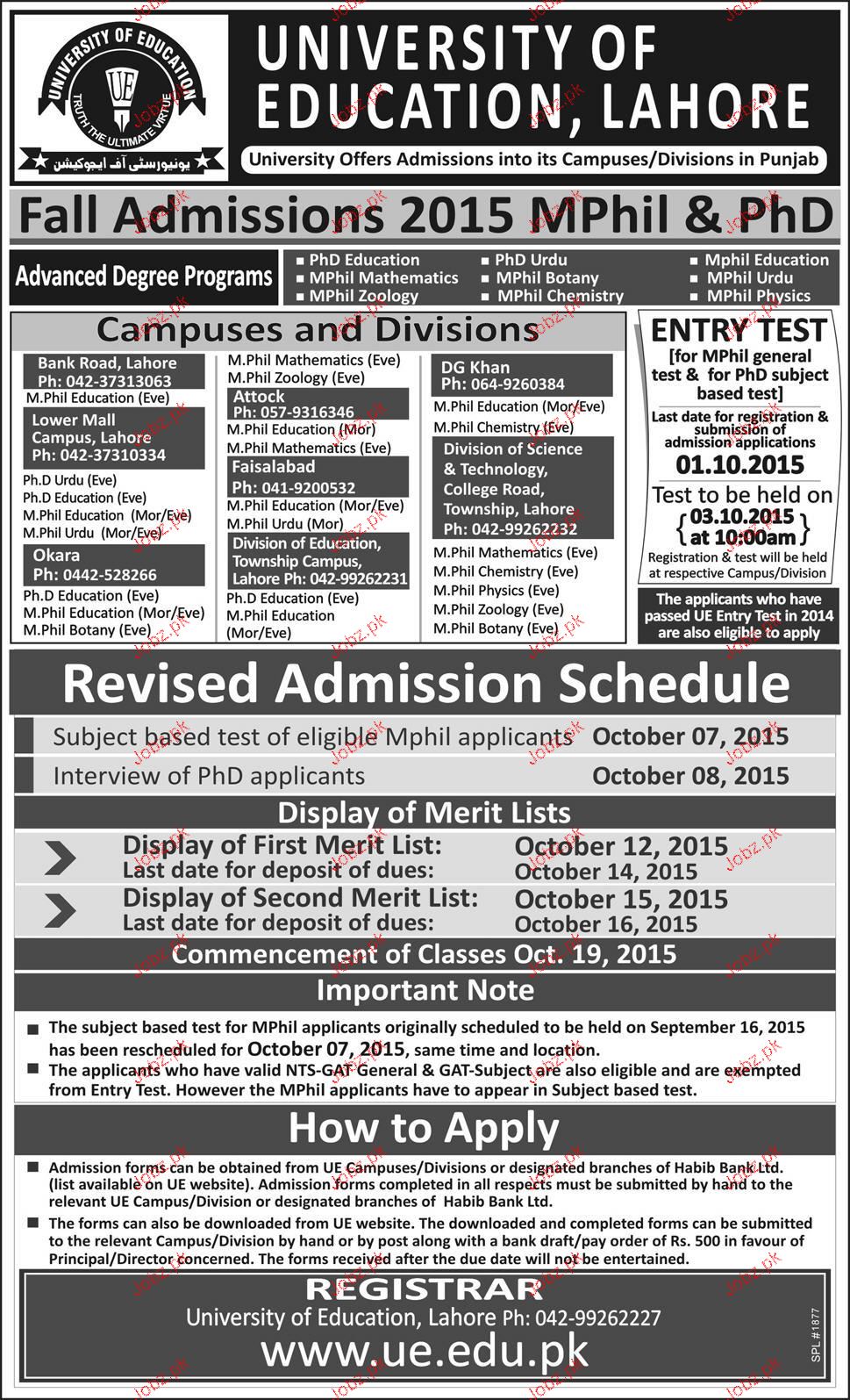 University of Education Lahore Admission in B.Mphill and Phd in Lahore. Read newspaper ad for exact details.
