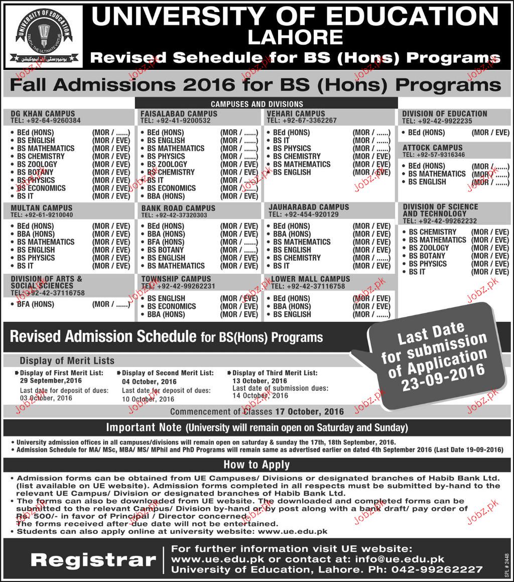 University of Education Lahore Admission in BS and B.Ed in Lahore. Read newspaper ad for exact details.