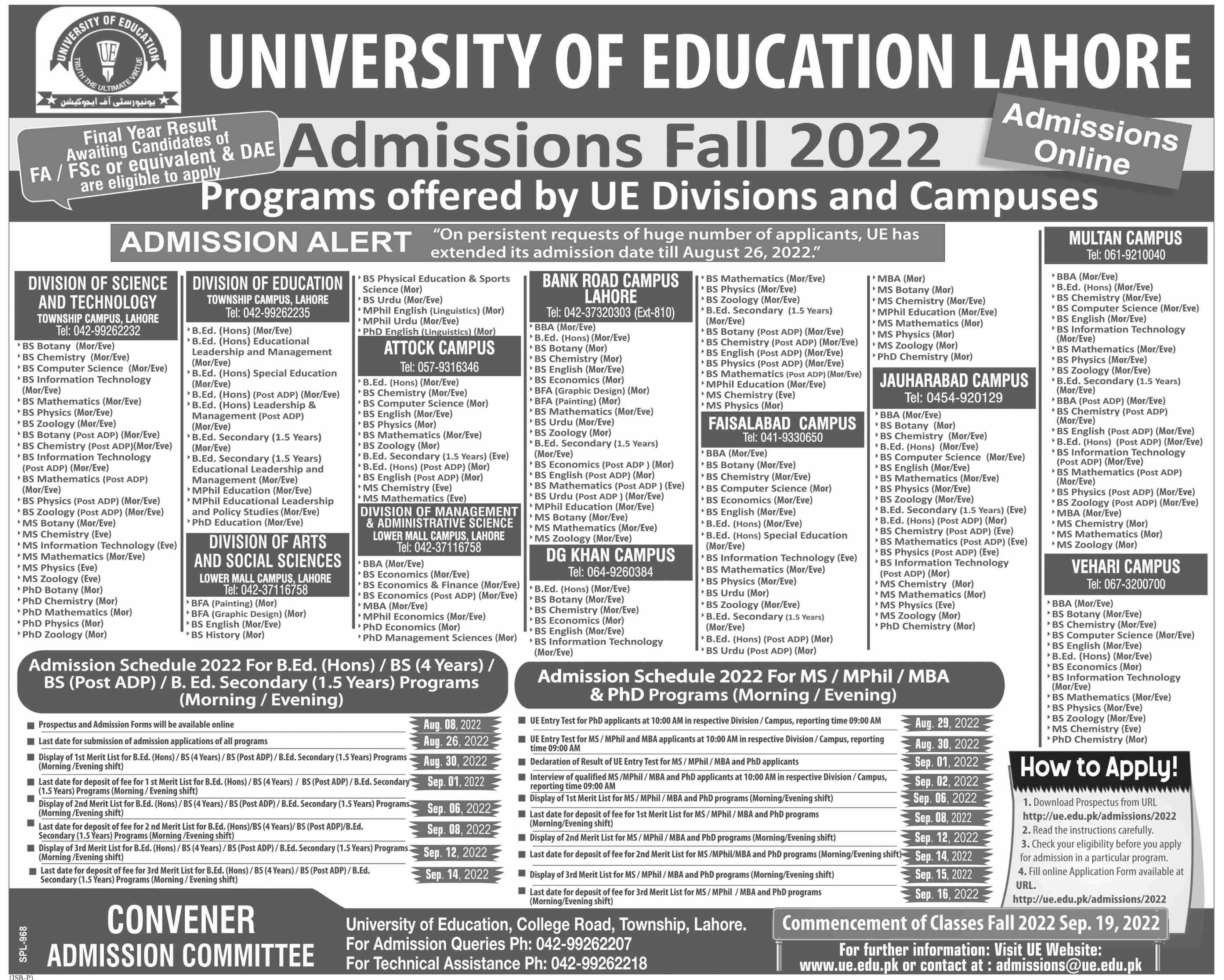 Admissions in University of Education 2022 for Bachelor of Science in Botany, Chemistry, Computer Science, Information Technology, Mathematics, Physics, Zoology. Master of Science in Botany, Chemistry, Information and Technology, Mathematics, Physics, Zoology. MPhil Education, Educational Leadership. PhD Education, English Linguistics. has been announced. Eligible students can apply for academic admissions 2022 in University of Education Lahore Punjab Pakistan for Teaching AIOU. Eligible students for fulfilling criteria for admissions in BS, Phd, Mphil and MS can enroll as per Private admission policy 2022 till closing date 31 August 2022. Read newspaper ad for exact details.