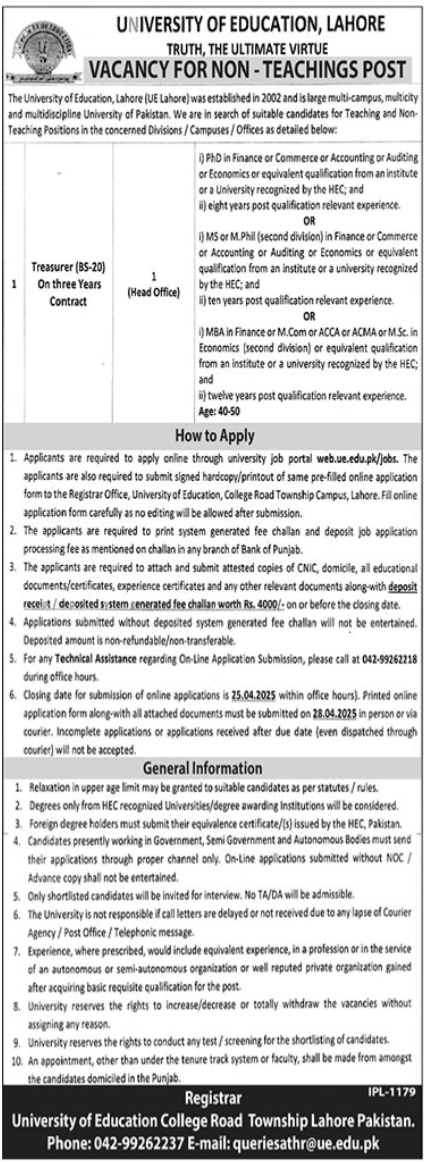 University of Education Lahore jobs advertisement dated about 28 March 2025 in daily The News Newspaper invites application for the vacant post of treasurer in Township Lahore, lahore Punjab Pakistan. Educational qualifications required Master, Bachelor and MS etc.