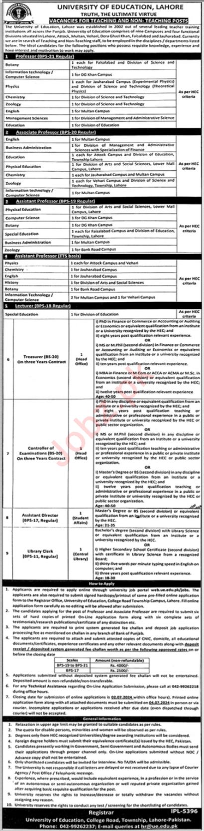 University of Education Lahore, lahore Punjab Pakistan invites applications from eligible candidates for the post of Assistant Director, Professor English, Associate Professor, Professor, Professor Information Technology, Professor Computer Science, Professor Education, Treasurer, Professor Management Sciences, Assistant Professor, Professor Botany, Professor Chemistry, Controller Of Examination, Professor Physics, Library Clerk, Lecturer and Professor Zoology as per advertisement of June 9, 2024 published in daily Jang Newspaper. Educational qualifications required Phd, Master, Mphil and Bachelor etc.