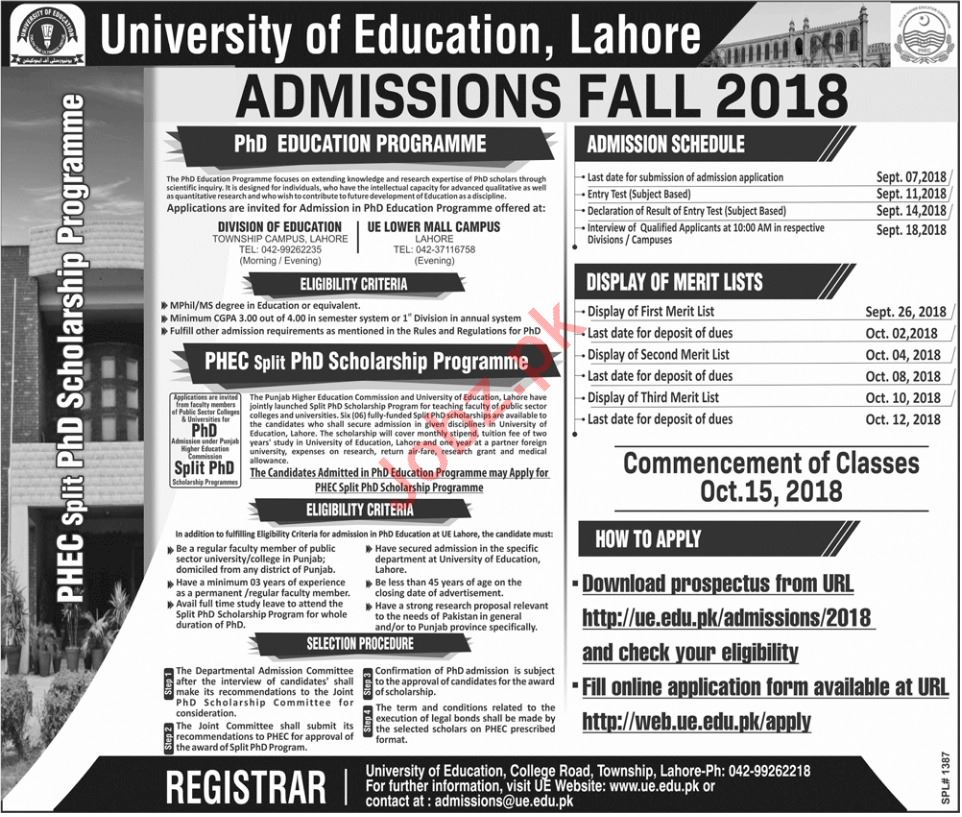 University of Education Lahore, Pakistan announced admissions fall 2018 for the classes of PhD Education Programme. Last date for submission of admission application form 07 September 2018. Read newspaper ad for exact details.