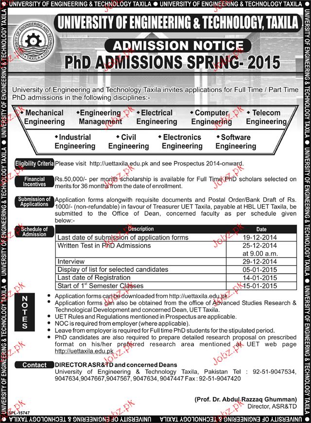 University of Engineering & Technology Lahore Admission in Phd in Taxila. Read newspaper ad for exact details.